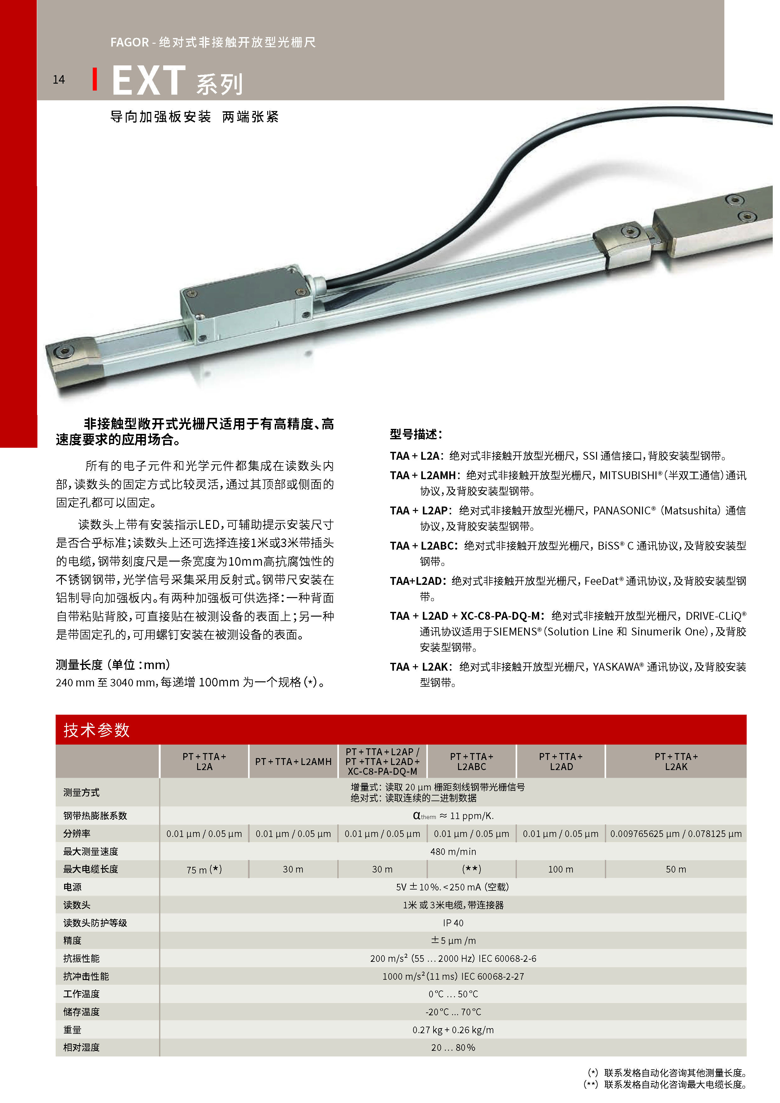 PT + TTA + L2AP: 绝对钢带刻度尺+支持Panasonic® (Matsushita)通信 协议的读数头+铝制导向加强板.